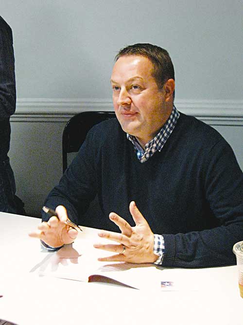 AUTHOR DAVE WEDGE talks with fans at the Flint Memorial Library. (Lori Lynes Photo)
