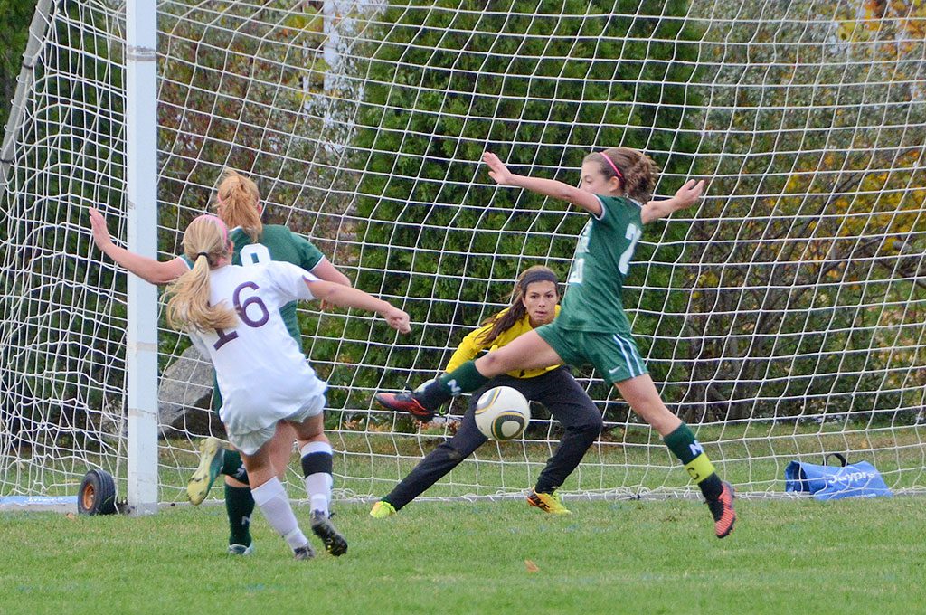 SENIOR CAPTAIN Kerri-Ann Donovan leaps in front of sophomore keeper Kat Hassapis in an attempt to block this Newburyport scoring attempt. (John Friberg Photo)