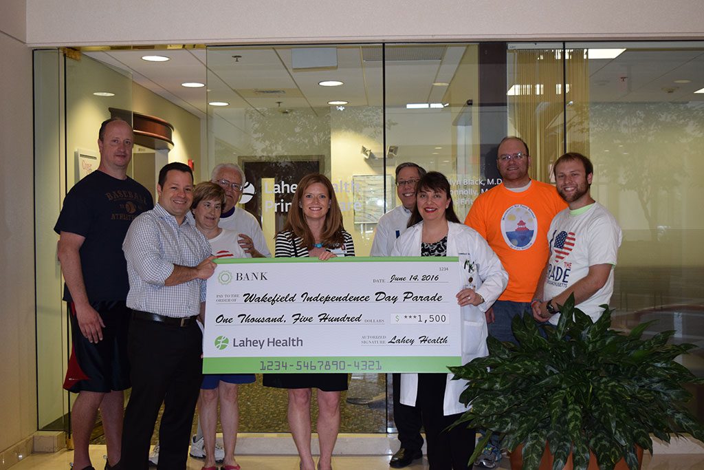 LAHEY HEALTH IS A SPONSOR of this year’s Fourth of July Parade. From the left are Wakefield Independence Day Committee volunteer Greg Powers; Dr. Douglas Fritz; WIDC volunteer Lois Benjamin; WIDC volunteer Dan Benjamin; Christine Healey; WIDC volunteer Jack Billiel; Dr. Lisa Connolly; WIDC volunteer Brian Fox and WIDC Chairman Patrick Sullivan. (Amy Braid Photo)