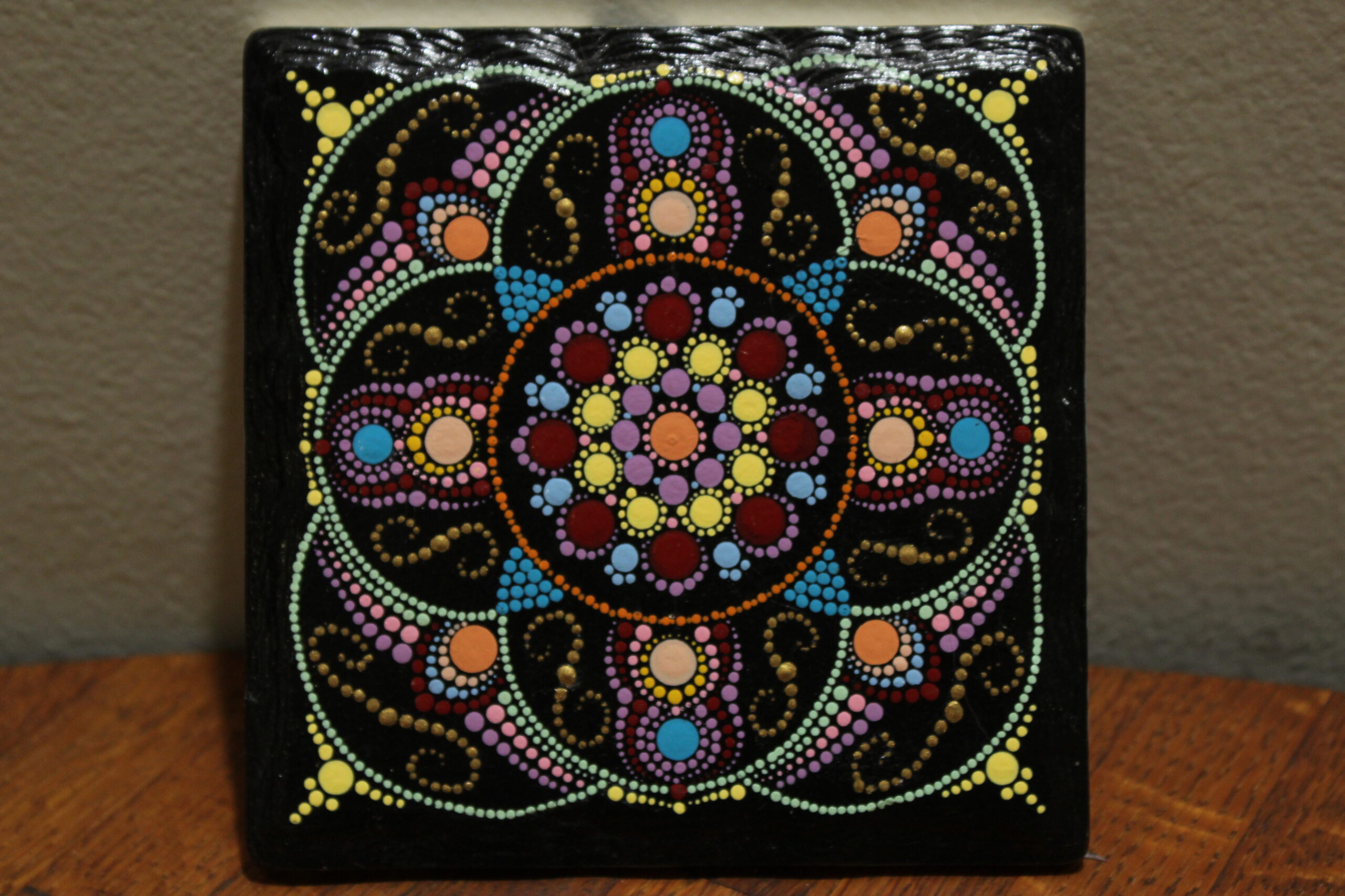 “I find it inspiring that sometimes, the material chooses the mandala: The perfect piece of stone, slate, wood, paper or glass already exudes the mandala’s mystical intention,” said Newman. “I will paint and repaint until this intention is communicated and a sense of peace and happiness resonates.”