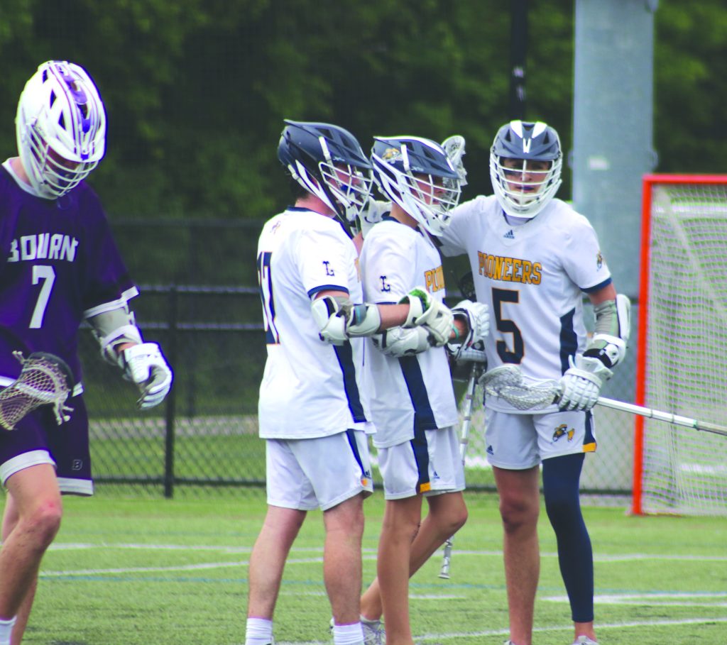 THE PIONEERS celebrate one of 6 goals for sophomore attackman John Powers during a 21-9 victory over Bourne in the first round of the Div. 4 state tournament at Pioneer Stadium on Friday. Pictured from left to right is Owen Doherty (3 assists), Powers and Mike Murphy (3 goals, 2 assists). (Courtesy Photo)