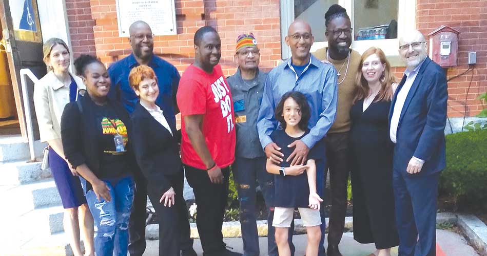 FROM THE LEFT: Kate Lipper-Garabedian, Janey David, Jamie Wilson, Wendy Joseph, Keshawn Little, Terry Carter, Joe Phillips, Michael Phillips (in front), Andre Bennette, Lily Martin and Mayor Paul Brodeur. (Neil Zolot Photo)
