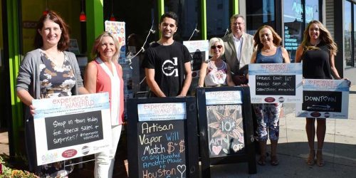 LOOK FOR THE Experience Wakefield A-frames outside local merchant establishments and around Lake Quannapowitt each Saturday, from now until December. The unique A-frames are designed to encourage everyone to shop locally. The A-frames have been generously donated by Wakefield Main Streets, The Savings Bank and the Wakefield Co-operative Bank, in collaboration with the merchants. Among the many local merchants and businesses helping to promote shopping locally are (left to right) Ally Houghton, marketing coordinator, The Savings Bank; Susan Wetmore, vice president, Wakefield Main Streets; Fcuzan Ahmad, Artisan Vapor Co.; Laura-Marie Small, Kidcasso; Mike Wojack, president Wakefield Co-operative Bank; Rada Frohlichstein, Rada Boutique; and Jennie Terry, marketing and social media manager, Wakefield Co-operative Bank.