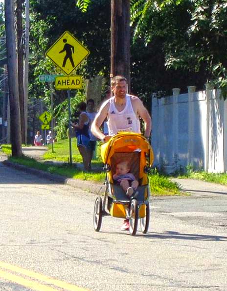 Shawn Wallace, the brother of Bill Wallace who coaches track and cross country at LHS and finished 22nd overall, almost won the event in 2014 while pushing his then five-year-old son, Owen.