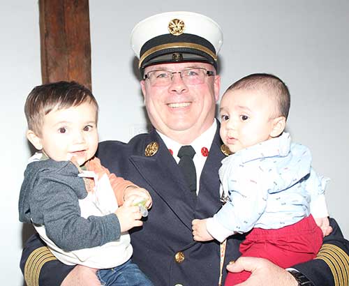 GLENN DAVIS received congratulatory hugs from his grandchildren Dominic (left) and Noah after he was sworn-in as fire chief on March 6. (Dan Tomasello Photo)