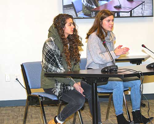 ITALIAN EXCHANGE STUDENT Laura Celli (left) and German exchange student Marike Jungk both said they enjoyed studying at LHS as part of the Educatius International program during a recent School Committee meeting. (Dan Tomasello Photo)