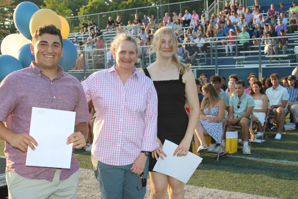 HISTORY AND SOCIAL SCIENCE Department Head Susan Breen presents the Michael Boulay Memorial Scholarship to seniors Domenic Micieli and Grace McKrell during Lynnfield High School’s Senior Awards Night at Pioneer Stadium on June 1. (Dan Tomasello Photo)