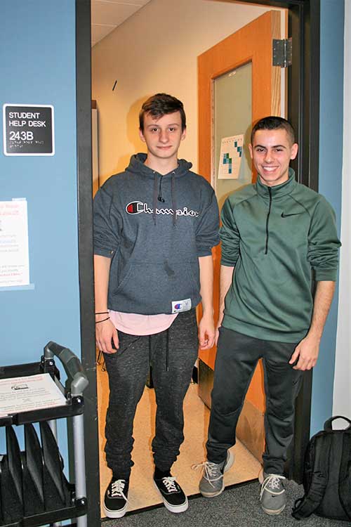 SENIOR Sebastian Fadel (left) and junior Joe Fabrizio show off the Student Help Desk repair center located inside the Lynnfield High School media center. (Jillian String Photo)