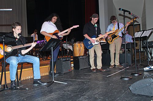 C BLOCK BAND MEMBERS, from left, vocalist/guitarist El Medford, rhythm guitarist Elizabeth Daly, lead guitarist Cole Fitzemeyer and bassist Jack Ross performed a cover of Guns and Roses’ “Paradise City” during Lynnfield High School’s Spring Concert on May 23. (Dan Tomasello Photo)