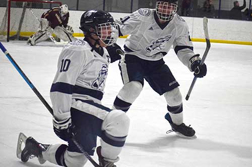 LYNNFIELD’S SENIORS, including George DeRoche (10) and Will Garofoli (21) have been waiting a long time for this. The boys beat Newburyport 5-4 on Feb. 6 for the program’s first win against the powerhouse Clippers in seven years. DeRoche had a hat trick and an assist to lead Lynnfield to the big win. (Robin DeBenedictis Photo)