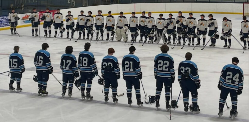 THE PIONEERS and Vikings line up before the first game of the season on Dec. 14 at the McVann-O’Keefe Rink. Triton won it, 4-1. (Courtesy Photo)