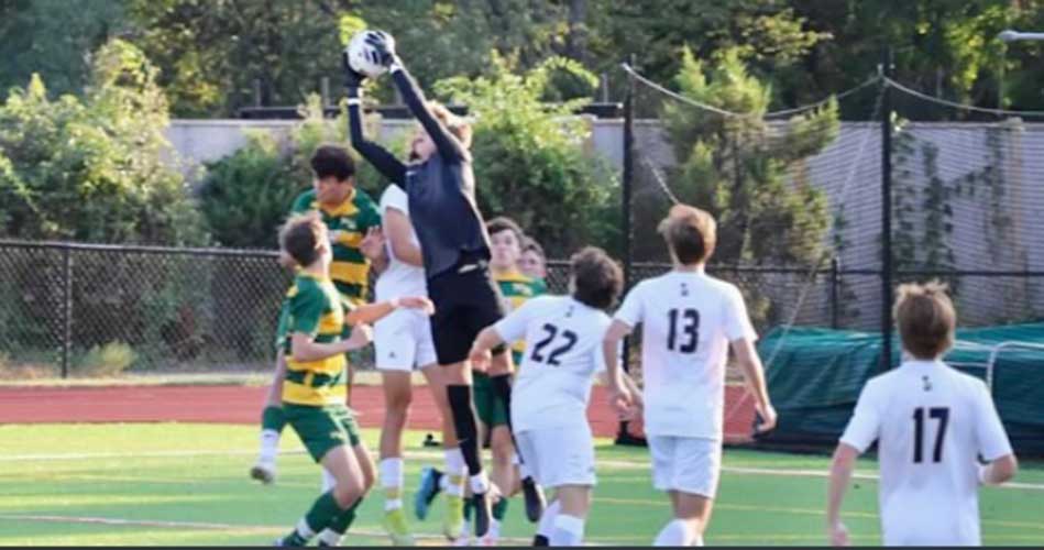 KELAN CARDINAL gets to a cross during Lynnfield’s 0-0 tie against North Reading on Thursday. That was Cardinal’s fourth shutout of the season as the Pioneers are now 5-0-1. (Kim Sokop Photo)