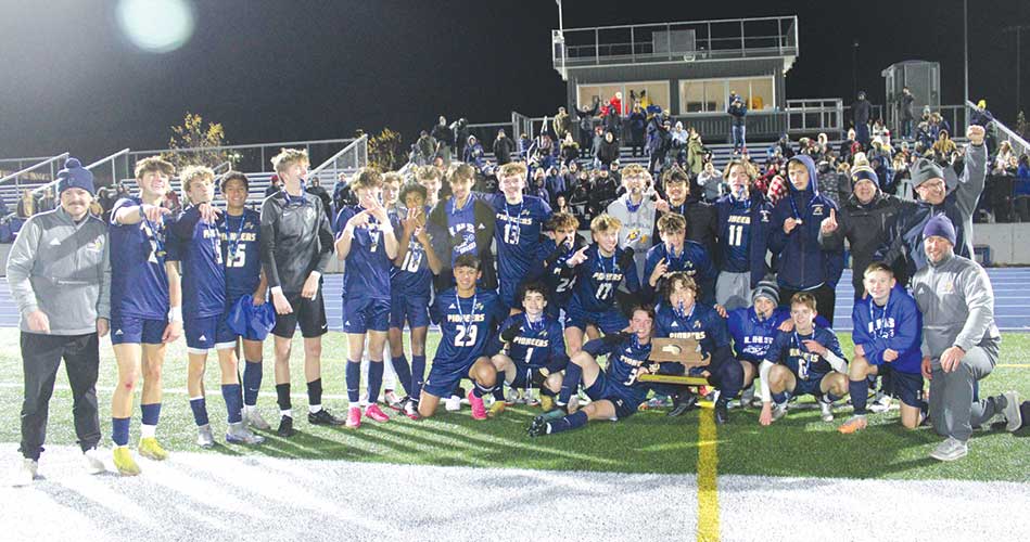 THE LHS BOYS’ SOCCER TEAM proudly displays the Division 4 state championship trophy after the second seeded Pioneers defeated ninth seed Monomoy 1-0 at Scituate High School on Nov. 18. (Dan Tomasello Photo)
