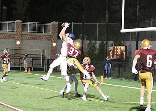 JUNIOR Clayton Marengi (11) catches his second touchdown of the day from senior quarterback Brett Cohee against Newburyport on Friday night. (Kerrianne Allain Photo)