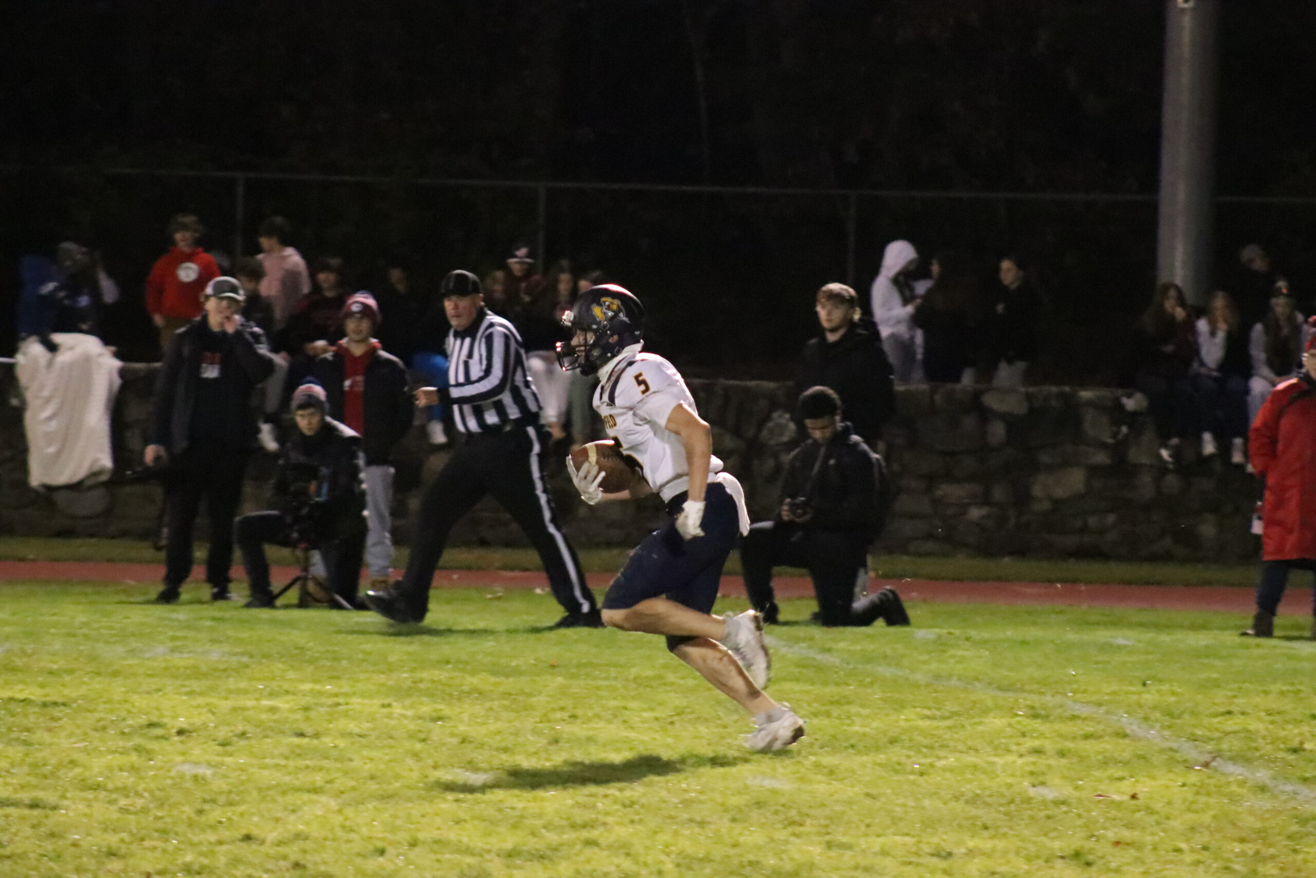 With daylight in front of him, the junior galloped down the sideline before getting tripped up 16-yards short of the endzone. The receiver miraculously stayed on his feet and looked like he would score. That was until Hudson senior Garrett Giorgio punched the ball free and junior Ben Jackson recovered it in the endzone thwarting Lynnfield’s momentum.