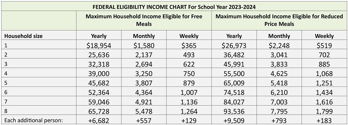 Household size and income criteria are used to determine eligibility for free and reduced-price benefits if the household does not receive assistance or the children are not in the other categories mentioned above. Children can get free or reduced-price meals if the household’s gross income falls at or below the limits on the Federal Income Eligibility Guideline chart.