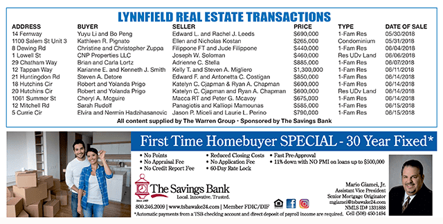 Lynnfield Real Estate Transactions published July 4, 2018