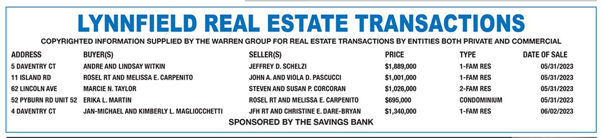 Lynnfield Real Estate transactions published June 21, 2023