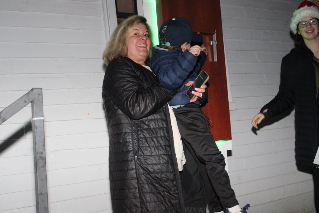 RETIRING RECREATION DIRECTOR Julie Mallett helps youngster Logan Fallon flick the switch that lit up the Town Common’s trees during Lynnfield Recreation’s recent Tree Lighting Ceremony. (Dan Tomasello Photo)