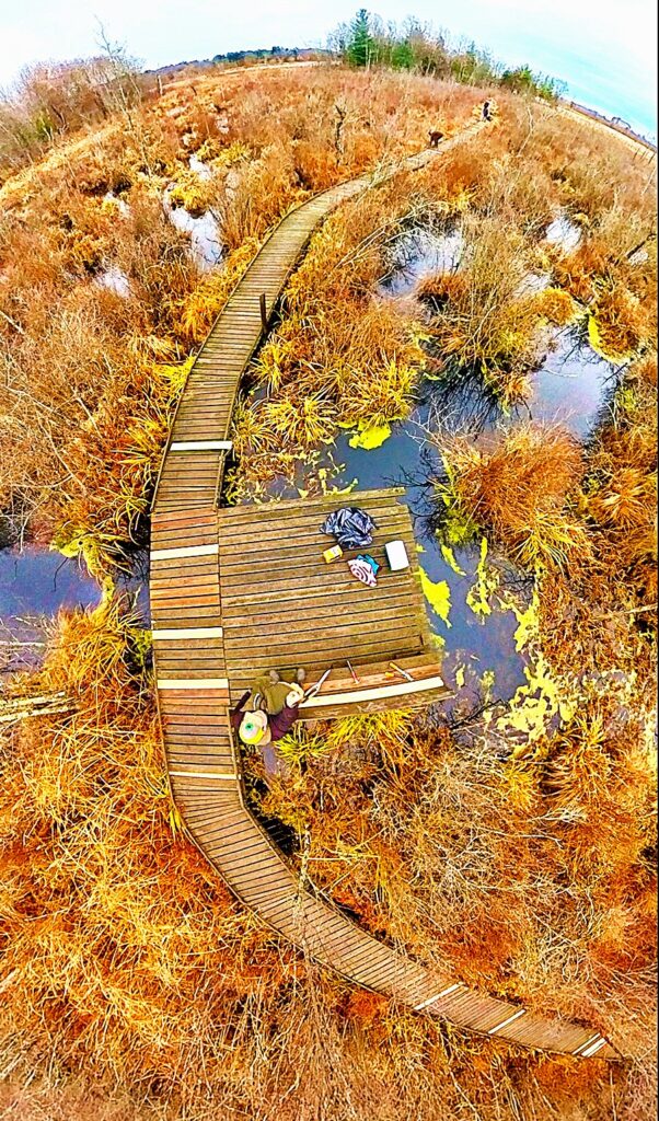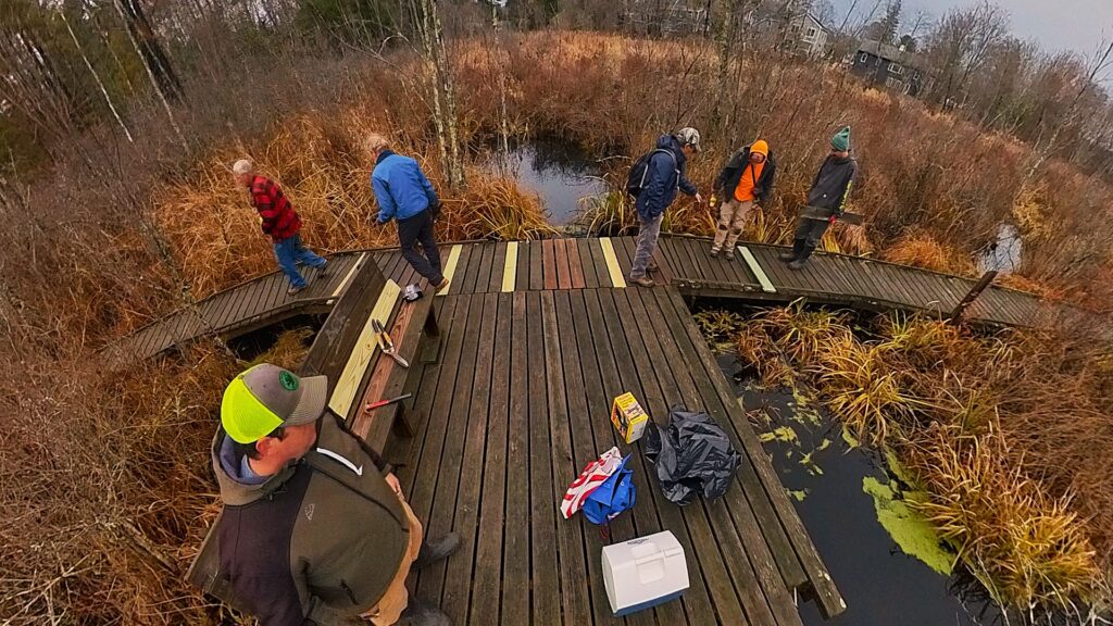 The work crew also included the professional services of Matthew Thompson and his co-worker Michael Almon. Thompson has much experience with construction of wetland crossings, including waterway pathways for the towns of Billerica and Medway, and boardwalk installations in the Parker River Wildlife Refuge and Harold Parker River Wildlife Refuge. Drone photos were produced by Steve Fantone. The town of Lynnfield purchased the needed lumber and supplies for the day’s build effort.