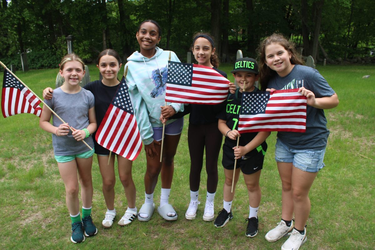 LYNNFIELD MIDDLE SCHOOL fifth-graders, from left, Ayla Davis, Melina Hibroj, Isla Boucher, Leah Steer, Matty Cabral and Ruby Curtis placed American flags at the gravestones at the West Burying Ground on May 16 in preparation of the town’s Memorial Day observance on May 26. (Dan Tomasello Photo)