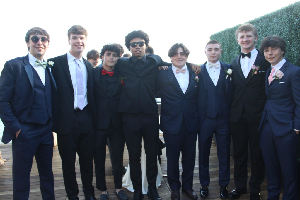 BUDDIES, from left, David Tracy, Matt Papagikos, Ethan Francis, Kyle Schmitz, Ethan Francis, Dylan Damiani, Jack Neenan, A.J. Chiaradonna, Ryan DeBenedictis kick back and relax at Lynnfield High School’s Senior Prom at the Beauport Hotel in Gloucester on May 29. (Dan Tomasello Photo)