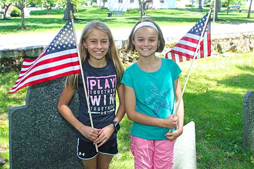 FRIENDS Aubrey Rocha (left) and Olivia Sieve paid tribute to the town’s fallen heroes by placing American flags on gravestones at the Old Burying Ground on May 24. The annual event is held before Memorial Day. (Dan Tomasello Photo)