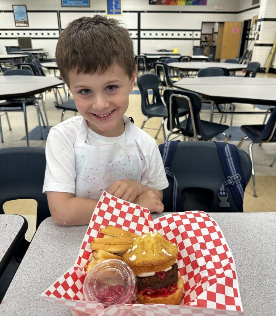 CAMPER Zachary Coletti shows off a cake he baked that resembled a cheeseburger during Lynnfield Community Schools’ Sweet Shoppe camp last week. Instructor Pam Shapleigh will be running the program at both elementary schools this fall. (Morgan Festa Photo)