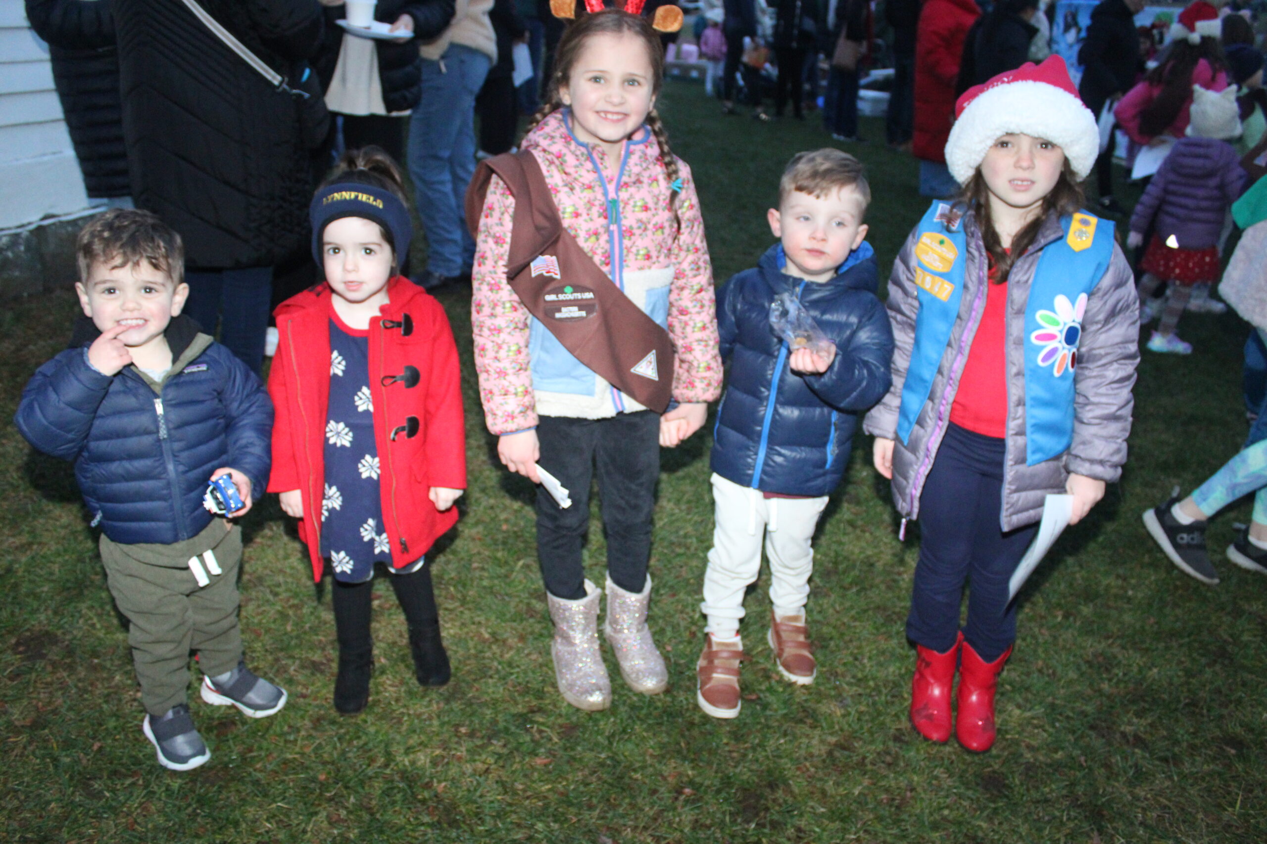 YOUNGSTERS, from left, Will LaBella, Rosie Staid, Charlotte LaBella, Benny Tracia and Ellie Staid had a blast during Lynnfield Recreation’s annual Tree Lighting Ceremony on Dec. 2. (Dan Tomasello Photo)