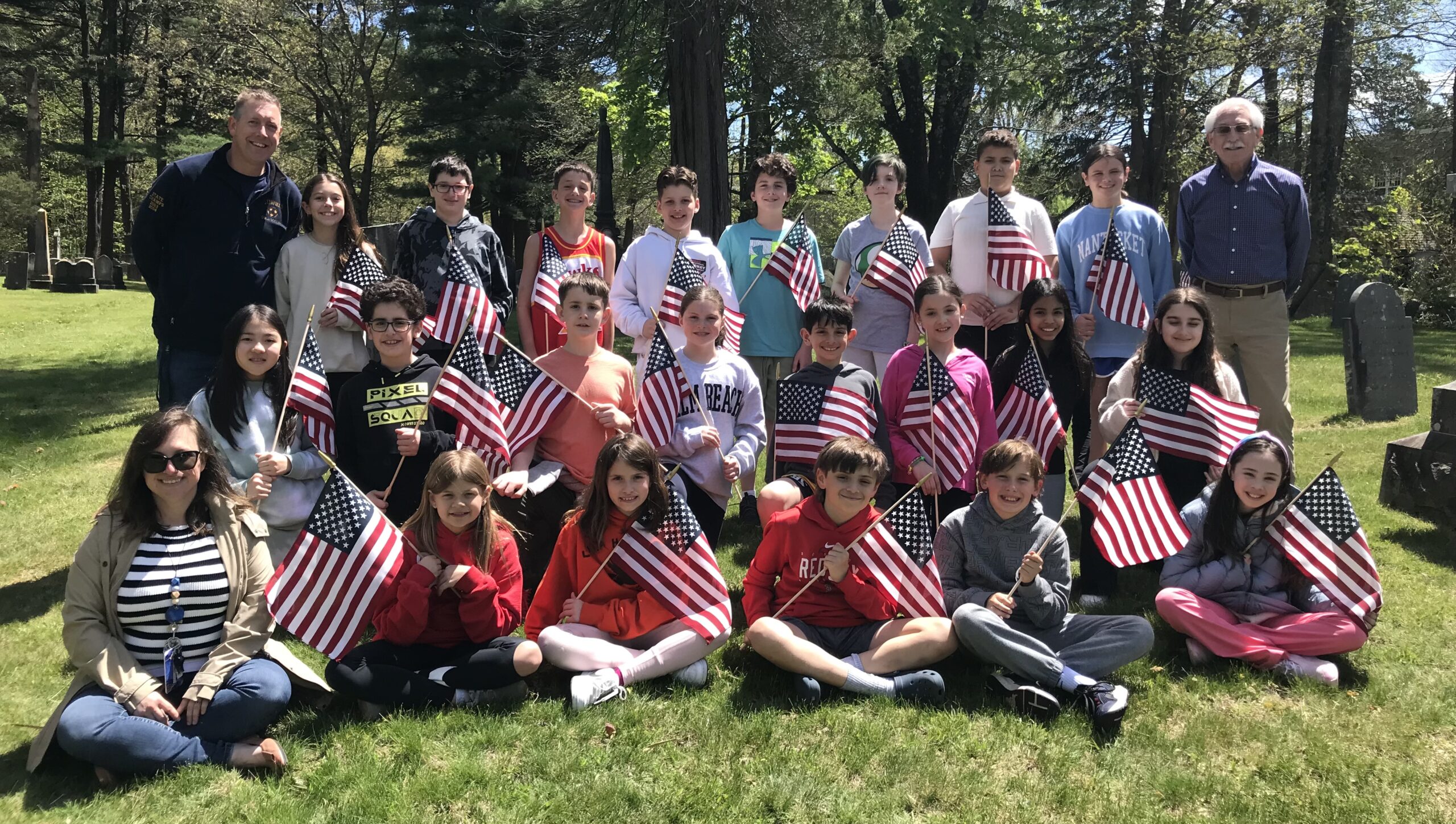 LYNNFIELD MIDDLE SCHOOL fifth grade teacher Mark Vermont and his students assisted Veterans Services Officer Bruce Siegel with placing American flags on the veterans graves at the West Burying Ground and the Old Burying Ground for Memorial Day last week. Front row, from left, Student Services teacher Elizabeth Jones, Zoey Gelling, Lucy Rosencranz, William Butler, Keegan McLaughlin and Emiko Yunes. Middle row, from left, Stella Park, Sam Monteiro-Azar, Vincent Reed, Evelyn Gentile, James Olaes, Angelina Hamilton, Avani Kapri and Ronika Salehian. Back row, from left, Vermont, Juliette Lavino, Ryan Dupont, Angelo DeSimone, Chase Pagos, Lucas Artsruni, Serenity Theriault, Elyas Bellagat, Catherine Caggiano and Siegel. (Candy Orlando Photo)