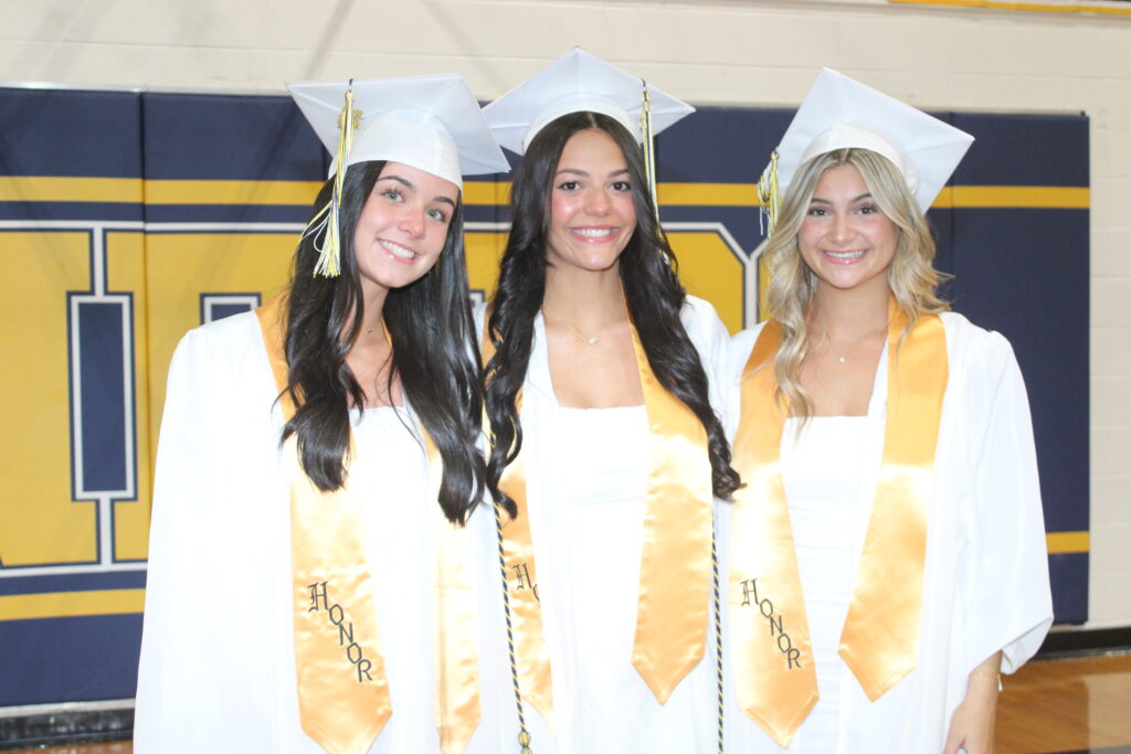 FRIENDS, from left, Lilyana DeLeo, Sophia Fiorentino and Nina Alfe hang out in the Lynnfield High School gym while gearing up for the Class of 2024’s graduation on May 31. (Dan Tomasello Photo)