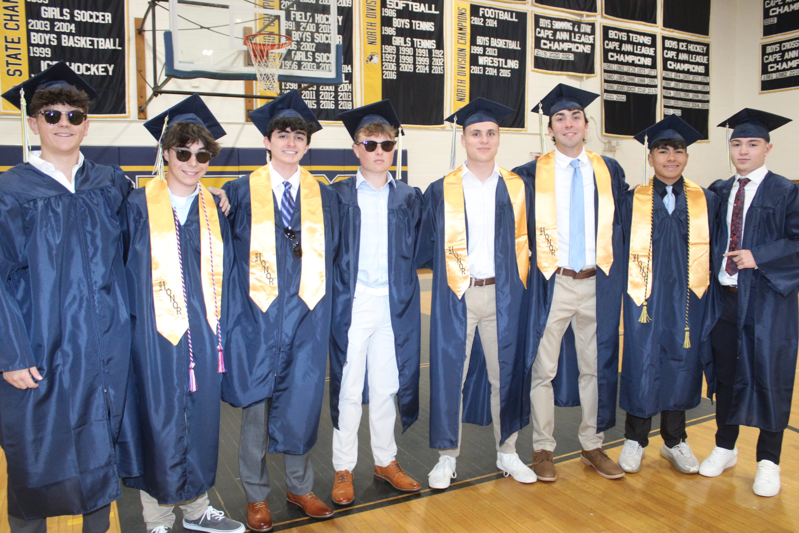 GOOD FRIENDS, from left, Gavin Leuci, Ryan DeBenedictis, Brendan Manoogian, Ryan MacEachern, Joey Cucciniello, David Tracy, Slate LoPilato and Jack Neenan were full of excitement while gearing up for Lynnfield High School’s Class of 2024 graduation ceremony on May 31. (Dan Tomasello Photo)