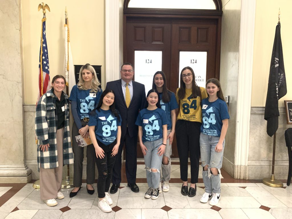 A HEALTHY LYNNFIELD YOUTH COUNCIL members recently visited the Massachusetts State House for Kick Butts Day. Students from across the state met with their local legislators to educate and inform our local leaders on the 84 Movement’s mission of youth tobacco prevention as well as relevant issues they are seeing in our community. From left, A Healthy Lynnfield Program Coordinator Lydia Sweetser, Alexis Lambros, Lorelei Eckhardt, House Minority Leader Brad Jones (R-North Reading), Annabelle Eckhardt, Ereeny Georges, Evyenia Georges and Shealyn Moore. (Dan Tomasello Photo)