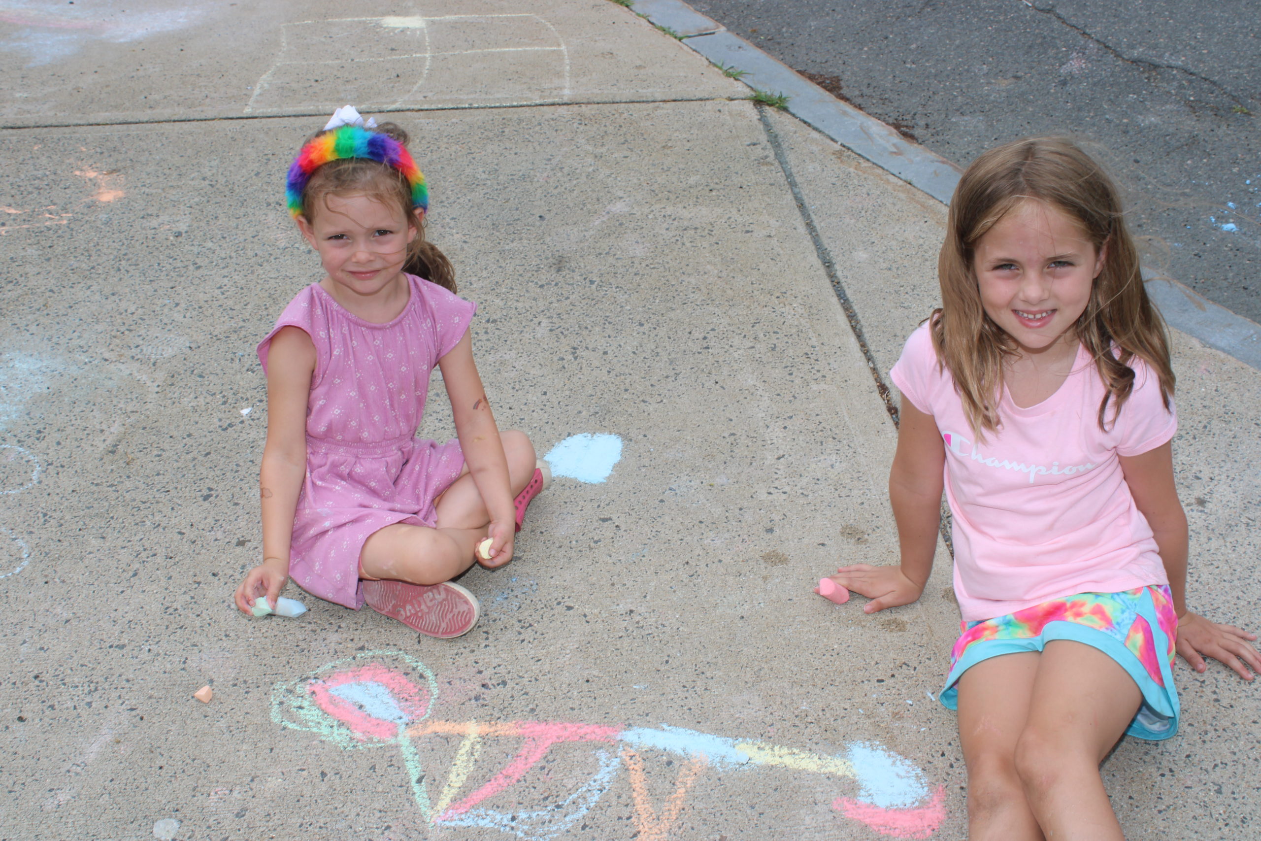 CAMPERS Anna Wein (left) and Winnie Gardner show off the sidewalk art they created at Recreation Station on July 27. (Dan Tomasello Photo)