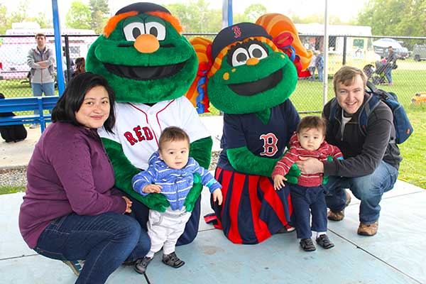 THE FRANKLIN family — from left, Jeannette, Zachary, Jacob and Jeremy — were all smiles while meeting Wally the Green Monster and Tessie during Geraniumfest and Kids’ Day on May 12. (Dan Tomasello Photo)