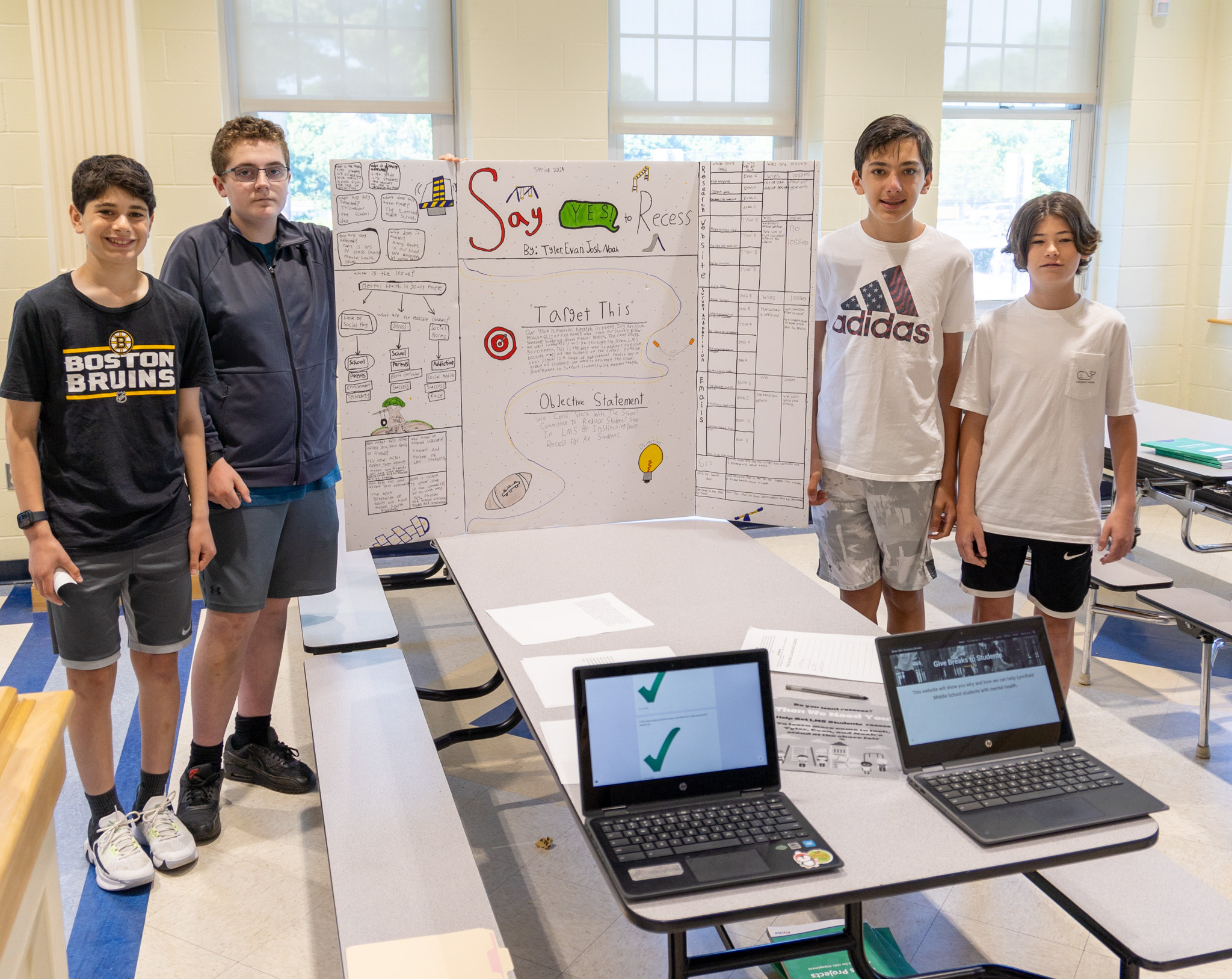 LMS EIGHTH-GRADERS, from left, Josh Reinold, Evan Carty, Tyler Bellandi and Noah Desrochers presented their Civics Action Project called “Say Yes To Recess” during a fair held on June 4. (Courtesy Photo)