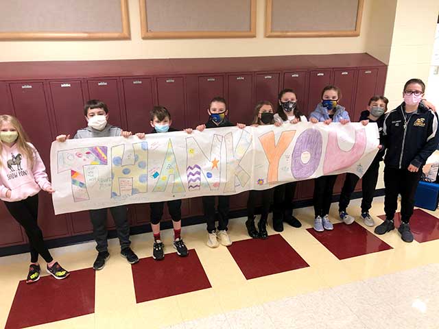 LMS FIFTH-GRADERS, from left, Hailey Crosbie, John Beccia, Tommy Burns, Cameron Chisholm, Meghan Geary, Ella Hodsdon, Rachael Long, Michael Hubbard and Jack Cullinane proudly display a poster they made for Lynnfield High School’s band room in order to thank first responders who received their first COVID-19 vaccine injection there on Jan. 14. (Courtesy Photo)