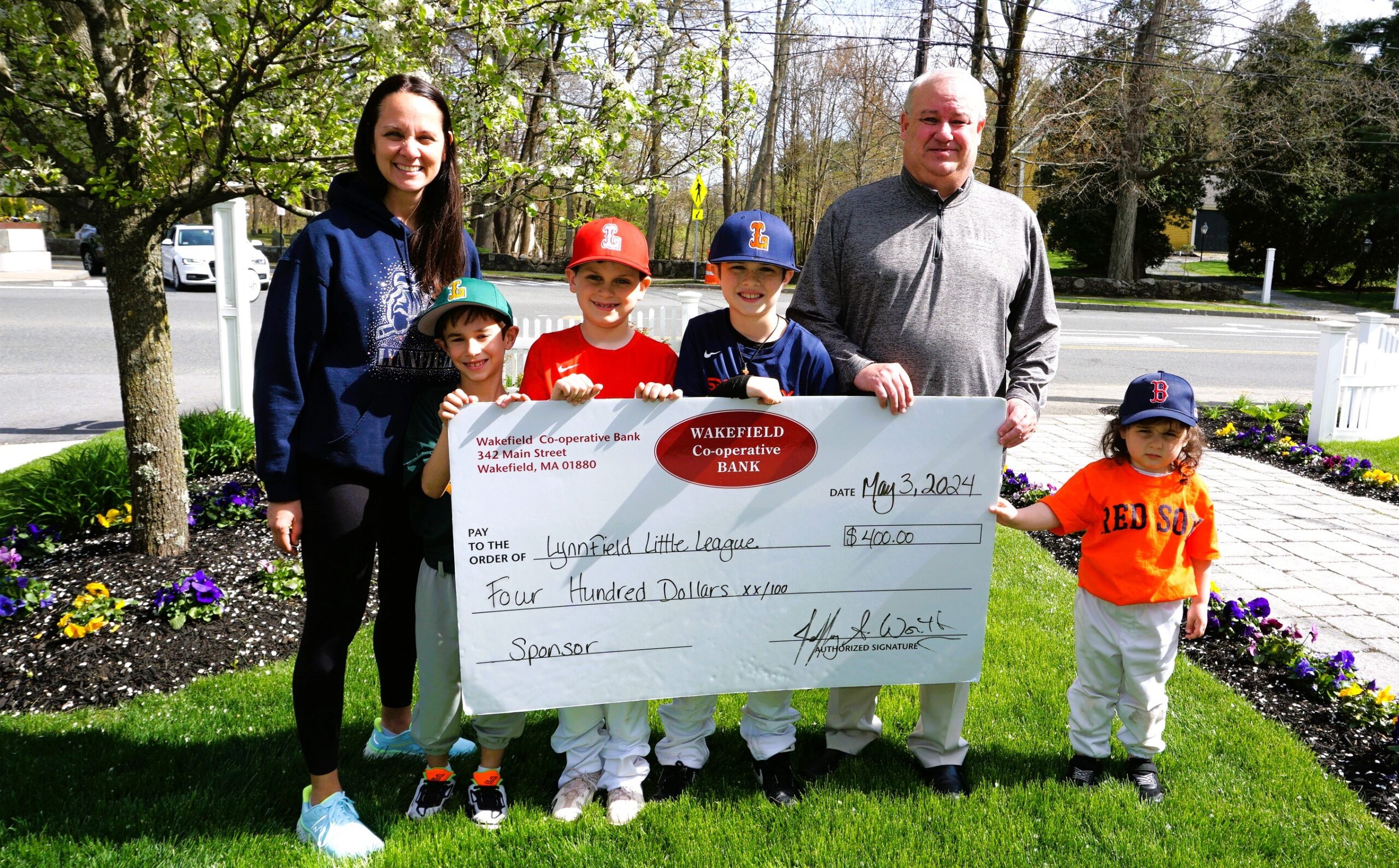 WAKEFIELD CO-OPERATIVE BANK is a proud sponsor of Lynnfield Little League’s 2024 Season, and recently gave Lynnfield Little League a $400 donation. Front row, from left, Little Leaguers William, Paul, Anthony and Josephine. Back row, from, Lynnfield Little League board member Diana DeLeo and Wakefield Co-operative Bank Branch Manager/AVP Bob Clattenburg.
