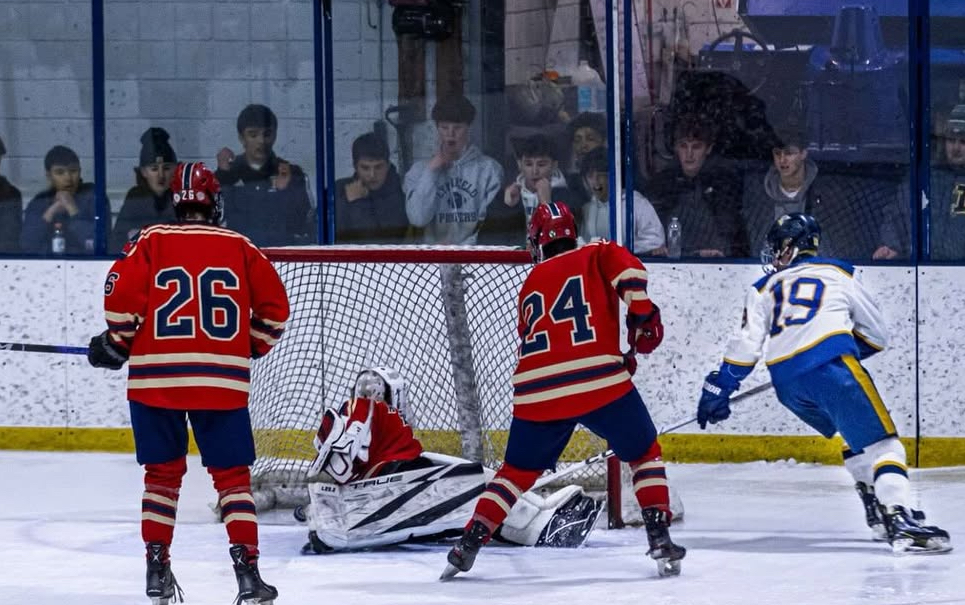 Calla is pictured here scoring Lynnfield’s game-winner in a thrilling, double overtime victory over North Middlesex on Feb. 26 at McVann-O’Keefe Rink. He finished with 2 goals and 2 assists in the victory. (Shlok Kudrimoti Photo)