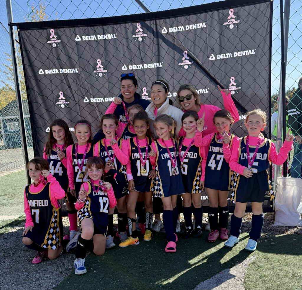 THE LYNNFIELD Youth Field Hockey U8 Gold team won their division at a tournament in Epping, NH on Oct. 20. In the front row from left to right is Bri Westrin and Harper Nunley. In the middle row from left is Carmella Crafts, Celine de la Mar, Meghan Kayola, Brynn Witherell, Frankie Amenta, Reese Clifford, Brynn Connelly, Grace Zinchuk and Ava Foote. In the back row is coach Lauren Kayola, coach Pauline de la Mar and coach Courtney Nunley. (Courtesy Photo)
