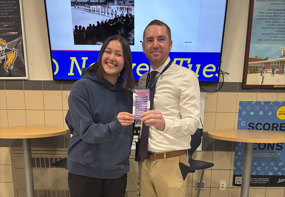 A HEALTHY LYNNFIELD Youth Council Leader Lauren Lane and Lynnfield High School Assistant Principal Mike McLeod unveil the Resource Magnet Project. The students researched, designed and distributed a magnet for all adults in the building to keep on desks and file cabinets so they have easy access to important phone numbers for students in need. (Courtesy Photo)