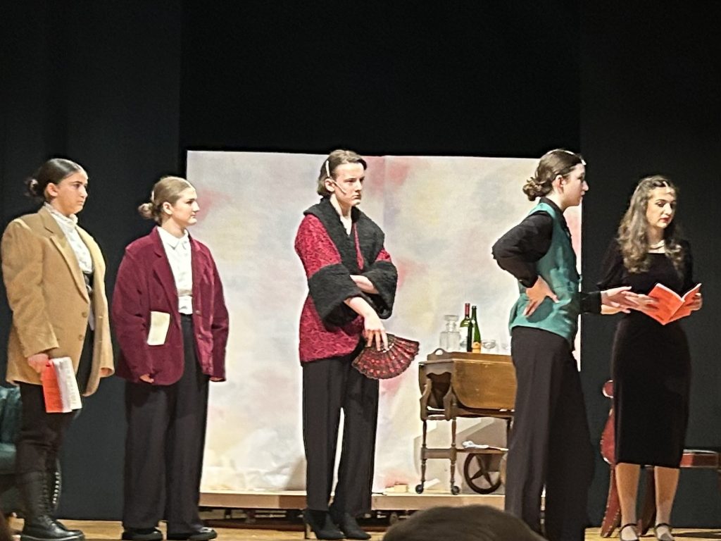 LYNNFIELD PUBLIC SCHOOLS’ THEATER PROGRAM’s recent production of “Clue (High School Edition)” featured, from left, Sabrina Hayman as Colonel Mustard, Lillian Spillane as Professor Plum, Patrick Malone as Miss Scarlet, Katie McGuinness as Mr. Green and Lila Martins as Mrs. White. The production was created over a 24-hour timeframe. (Courtesy Photo)
