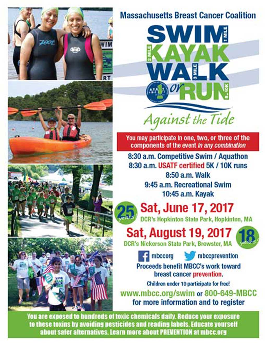 Massachusetts Breast Cancer Coalition (MBCC) will be holding its annual, statewide Against the Tide Swim, Kayak, Walk, Run and/or Aquathon fundraising events again in 2017. Proceeds benefit MBCC, which is the state’s leading breast cancer organization that seeks to understand the causes of breast cancer in order to find ways to prevent the disease.