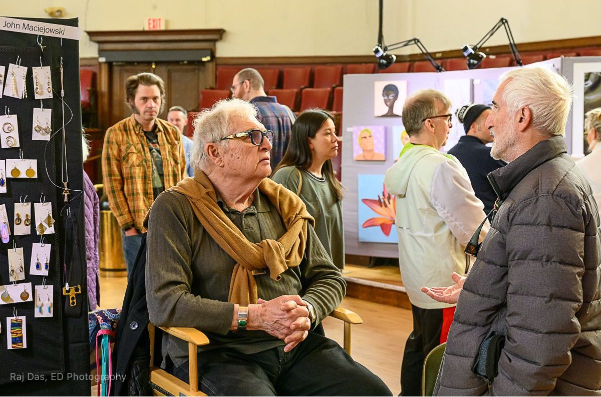 THIS JEWELRY MAKER listens as a Melrose Arts Festival attendee makes his point. (Photo by Raj Das, edphotos.com)