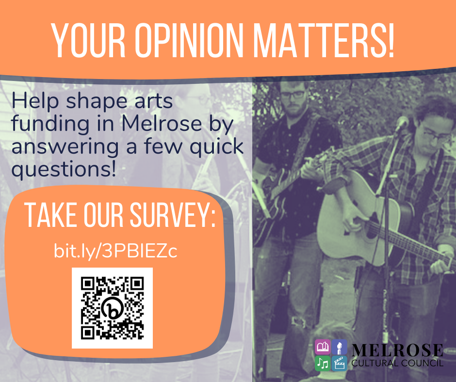 The Council appreciates hearing from you. Please take a moment to complete by visiting their website at melroseculture.org/news.About the Council: The Melrose Cultural Council is the local affiliate (LCC) of the Massachusetts Cultural Council. The Melrose Cultural Council seeks to promote excellence, education, cultural diversity, inclusion, and foster a rich and vibrant cultural life in Melrose. Grants are given to Melrose organizations, individuals, and Massachusetts’s artists/presenters in partnership with local organizations. They encourage and support programs across all arts and disciplines – visual arts, music, drama, dance, writing, projects in the humanities, history, local culture, and interpretive sciences. Events may include concerts, theater and dance performances, artists-in-residence, poetry slams, festivals, workshops, exhibits, public art, murals and installations.