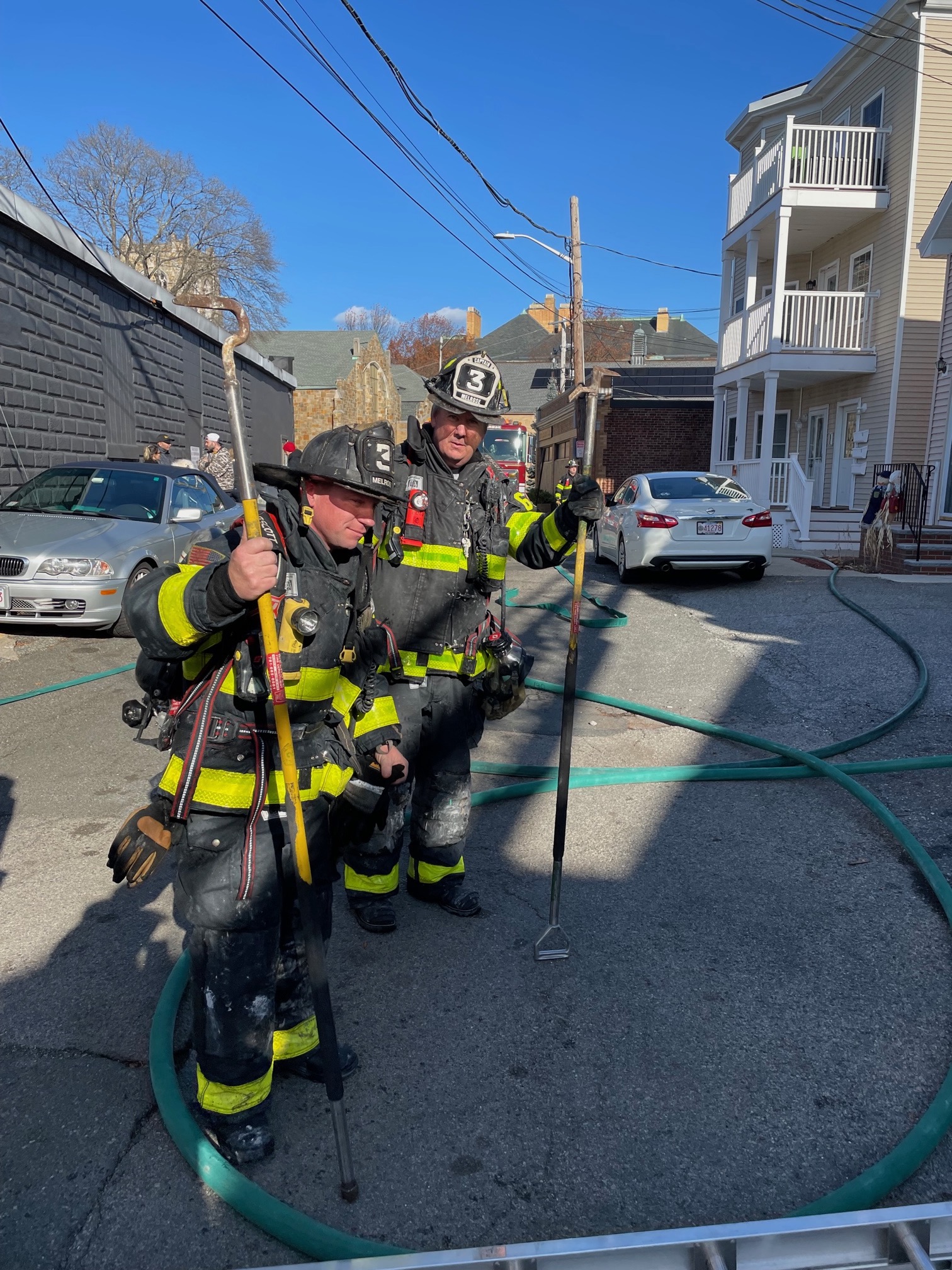 “The ladder crew did a great job maneuvering the stick (the aerial ladder) around power lines and other wiring. They got up quickly and were one of the keys to this fight.”