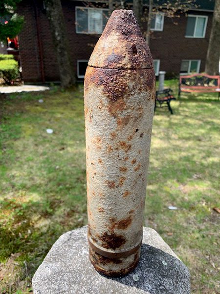 Fire Chief Ed Collina said the 3-inch by 1-foot shell was found while excavating work was being done on a Warren Street lot around 11:35 a.m. Under the watchful eye of shift commander Capt. Chris Dillon, Lt. Ken McIntosh’s Engine 2 crew reported to the scene. They eventually took photographs of the found ordnance and sent them to the Bomb Squad, which concurred that the shell had to be disposed of with a controlled detonation.