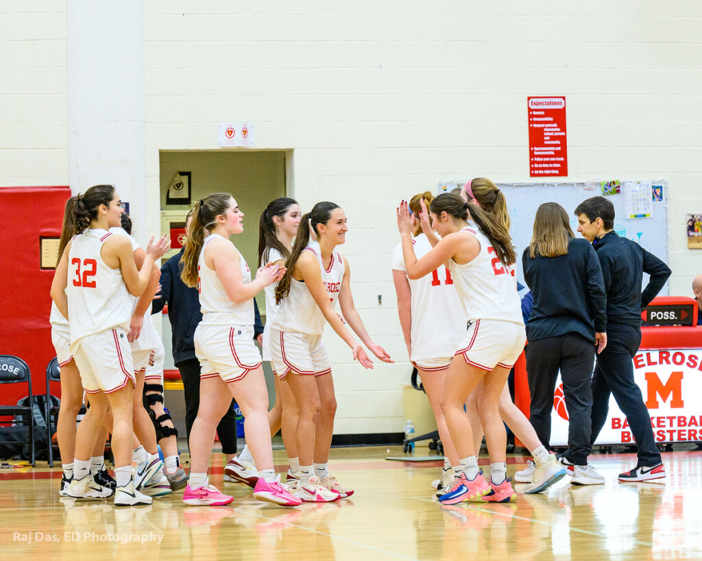It was a game that saw spread out offense from Lily Nolan, Sophia DiCalogero and Lara McLucas, who all had 9 points. Alex Leeman played solid defense and had 7 points. Melrose had sent to the floor their starters, junior Alex Leeman, junior capt. Scarlett D’Addio, junior Sophia DiCalogero, senior capt. Lily Nolan and sophomore Kayla Good.
