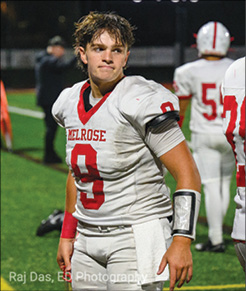 THIS WEEK’S Melrose High Athlete of the Week has led Melrose varsity football to back-to-back wins as quarterback, most recently an impressive 21-7 victory over Woburn. Senior captain Jack Feeney helped Melrose football amass 279 total yards on offense against the Tanners last Friday. Casey threw for over 150 yards and rushed for more, which helped Melrose pull away from the Tanners, 21-7, to improve to 3-1 on the season. Congrats to Jack and the entire Melrose football squad for another winning week!