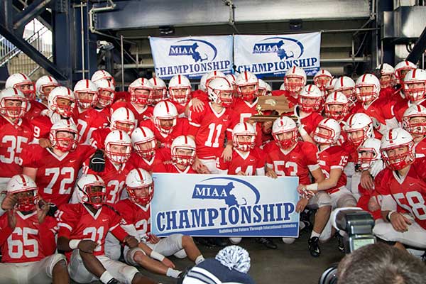 •Melrose wins the Super Bowl. On December 2, 2017 Melrose became the Div. 4 State Champions with a 21-0 shutout victory over Nashoba Regional in front of a legion of Melrose fans at Gillette Stadium in Foxboro. The Red Raiders finished their season perfect at 13-0, a flawless record not matched since 1946. It was Melrose’s fourth attempt at a Super Bowl win, with previous trips in 1982, 2014 and 2015. As winners, Melrose chose a jersey bearing former player Ray Rocha’s number to be enshrined in Gillette Stadium’s Patriot Place Hall of Fame for one year to represent Melrose. A touching tribute in a perfect season.